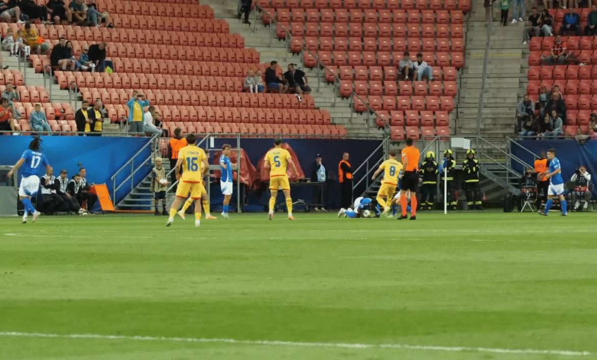 ”Azzurrini” au fost aproape să îşi dubleze avantajul, dar Koleosho (44) a tras în bară după o minge pierdută de Umit Akdag.Finalul reprizei a aparţinut echipei noastre, dar Pirola a blocat şutul lui Rareş Ilie (44), după care Cristian Ignat a fost contrat în careu de Ndour (45), iar România a primit penalty, la semnalizarea arbitrajului video. Louis Munteanu nu a reuşit să înscrie de la 11 metri, şutul său fiind apărat de Desplanches (45+3).România a încercat mai mult pe atac în partea secundă şi chiar a trimis mingea în poartă, prin Ianis Stoica (61), dar golul a fost anulat pentru ofsaid.Echipa antrenată de Carmine Nunziata şi-a mai creat ocazii bune de gol prin Pirola (64), a cărui lovitură de cap a trecut puţin pe lângă poartă, după un corner, şi prin Baldanzi (67), care a tras de la 16 metri, dar Sava a respins în bară.Tricolorii au mai avut o oportunitate prin Borza (89), dar acesta a tras peste poartă din careu, şi mai ales prin Mitrov (90+1), care a trimis un lob pe lângă poarta goală.În celălalt meci al grupei, Spania a învins Slovacia cu 3-2.Următoarele partide din grupă se vor juca sâmbătă 14 iunie, Spania – România (la Bratislava, ora 19:00) şi Slovacia – Italia (la Trnava, ora 22:00).Selecţionata de tineret a României participă la Campionatul European U21 din Slovacia, care se desfăşoară în perioada 11-28 iunie.Cel mai bun rezultat al României în cele patru participări de până acum la Campionatul European de tineret (1998, 2019, 2021, 2023) l-a înregistrat în 2019, când a atins faza semifinalelor, reuşind totodată şi calificarea la Jocurile Olimpice de la Tokyo 2020.La ultima ediţie a EURO U21, organizată de România împreună cu Georgia, naţionala de tineret a încheiat pe ultimul loc al grupei din care mai făceau parte Spania, Ucraina şi Croaţia, cu doar un1 punct.Italia – România 1-0 (1-0)A marcat: Tommaso Baldanzi (26).Louis Munteanu a ratat un penalty în min. 45+3 (a apărat Sebastiano Desplanches).Trnava, Anton Malatinsky StadiumCampionatul European Under-21 din 2025 – Grupa AAu evoluat echipele:Italia: 1. Sebastiano Desplanches – 2. Mattia Zanotti (13. Michael Kayode, 87), 6. Daniele Ghilardi, 5. Lorenzo Pirola (căpitan), 3. Matteo Ruggeri – 14. Giovanni Fabbian, 4. Matteo Prati, 7. Cher Ndour – 11. Tommaso Baldanzi (20. Niccolo Pisilli, 86), 17. Luca Koleosho (8. Cesare Casadei, 63) – 10. Wilfried Gnonto (9. Giuseppe Ambrosino, 63). Selecţioner: Carmine Nunziata.Rezerve neutilizate: 12. Gioele Zacchi, 22. Jacopo Sassi – 15. Diego Coppola, 16. Riccardo Turicchia, 18. Issa Doumbia, 19. Gabriele Guarino, 21. Jacopo Fazzini, 23. Alessandro Bianco.România: 1. Răzvan Sava – 2. Tony Strata (2. Dan Sîrbu, 61), 3. Cristian Ignat (20. Ovidiu Perianu, 46), 6. Matei Ilie, 11. Andrei Borza – 17. Marius Corbu (10. Octavian Popescu, 46), 5. Umit Akdag, 8. Constantin Grameni (14. Zoran Mitrov, 87) – 7. Ianis Stoica (18. Rareş Burnete, 61), 9. Louis Munteanu (căpitan), 19. Rareş Ilie. Selecţioner: Daniel Pancu.Rezerve neutilizate: 12. Otto Hindrich, 23. Vlad Rafailă – 4. Costin Amzăr, 13. Matteo Duţu, 15. Cătălin Vulturar, 21. Cristian Mihai.Arbitru: Vassilis Fotias; arbitri asistenţi: Andreas Meintanas, Michail Papadakis (toţi din Grecia); al patrulea oficial: Igor Stojchevski (Macedonia de Nord)Arbitru video: Angelos Evangelou (Grecia); arbitru asistent video: Bastien Dechepy (Franţa)Cartonaşe galbene: Munteanu (20), Grameni (47), Fabbian (90).