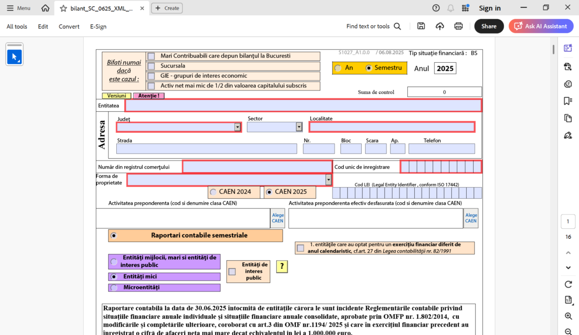 ANAF a publicat, miercuri, 6 august 2025, noul formular PDF editabil pentru firmele care trebuie să facă raportarea semestrială la 30 iunie 2025, termenul de depunere a raportării la Fisc fiind 18 august 2025.AdsVorbim despre S1027 – S1050 – Sistemul de raportare contabilă la 30 iunie 2025 a operatorilor economici (microentităţi, entităţi mici, respectiv mijlocii şi mari, precum şi entităţi de interes public) aprobat prin Ordinul ministrului Finanțelor nr. 1194/22.07.2025.Obligația de raportare se aplică firmelor care în exerciţiul financiar precedent au înregistrat o cifră de afaceri netă mai mare decât echivalentul în lei a 1.000.000 EUR. Cursul valutar luat în considerare este 4,9741 lei/1 EUR, a explicat consultantul fiscal Cornel Grama.Raportările contabile la 30 iunie 2025 se depun la ANAF până cel mai târziu la data de 18 august 2025. Raportările, în formă electronică, se depun pe portalul www.e-guvernare.ro, semnate cu certificat digital calificat. Formatul electronic al raportărilor contabile constă într-un fișier PDF la care este atașat un fișier xml.Entităţile care nu au desfăşurat activitate de la data înfiinţării până la 30 iunie 2025, cele care în tot semestrul I al anului 2025 s-au aflat în inactivitate temporară, cele înfiinţate în cursul anului 2025, precum şi persoanele juridice care se află în curs de lichidare NU întocmesc raportări contabile la 30 iunie 2025.Continuarea pe Startupcafe