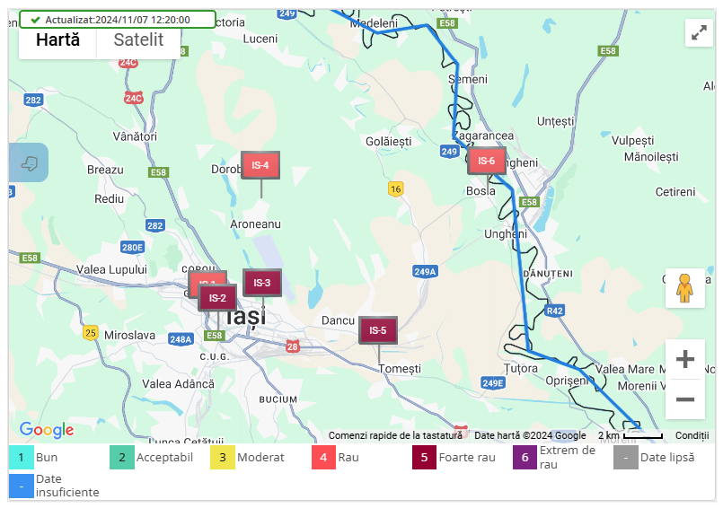 Conform monitorizării din ultimele 24 de ore, indicele general de calitate a aerului s-a deplasat de la „Rău” la „Foarte rău” pentru factorul poluant PM 2,5. Pentru indicele PM 10, valoarea se menține pentru categoria „Rea”.