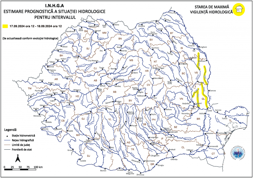 Pe parcursul intervalului 17.09.2024 ora 12:00 – 18.09.2024 ora 12:00, se preconizează fenomene hidrologice pe râurile din bazinele hidrografice: Bârlad – afluenții de stânga aferenți sectorului aval S.H. Vaslui (judetele: Iași, Vaslui și Galați), Siret – afluenții de stânga aferenți sectorului aval S.H. Lungoci (județul Galați), Prut – afluenții aferenți sectorului aval S.H. Drânceni (județele: Vaslui și Galați).