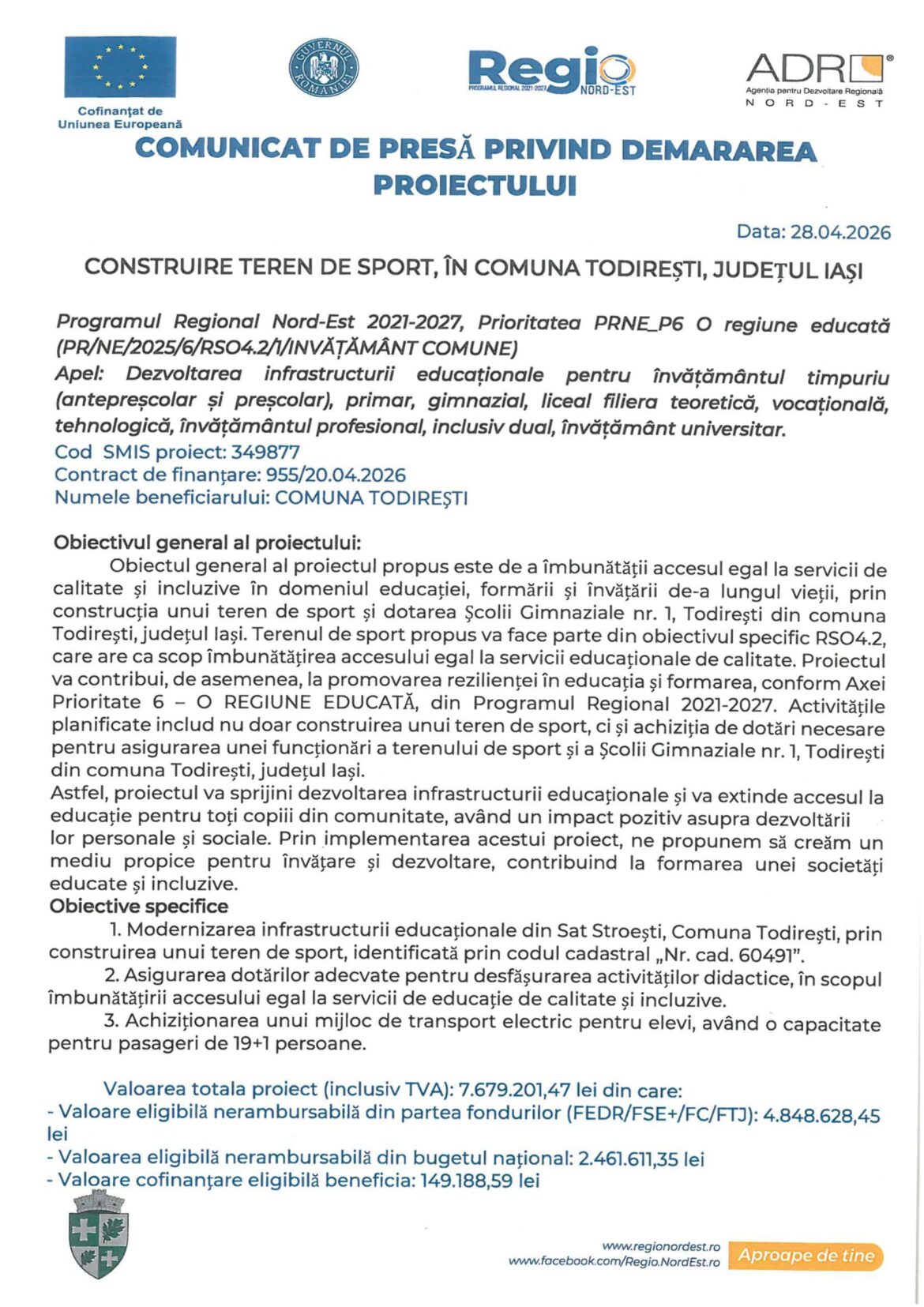 Comunicat: Construire teren de sport în Comuna Todirești judetul Iasi 2026-04-28
