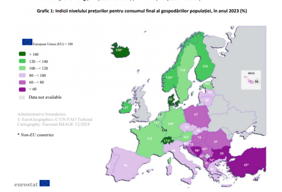 Pentru anul 2023, Bulgaria a înregistrat cel mai scăzut nivel al prețurilor pentru bunurile de consum și serviciile corespunzătoare consumului final al gospodăriilor, fiind cu 41% sub media Uniunii Europene. România urmează, situându-se cu 39% sub această medie. De cealaltă parte, Danemarca a avut cele mai ridicate prețuri, cu 45% peste media UE, fiind urmată de Irlanda (37% peste media UE), Luxemburg (34% peste media UE) și Finlanda (24% peste media UE).