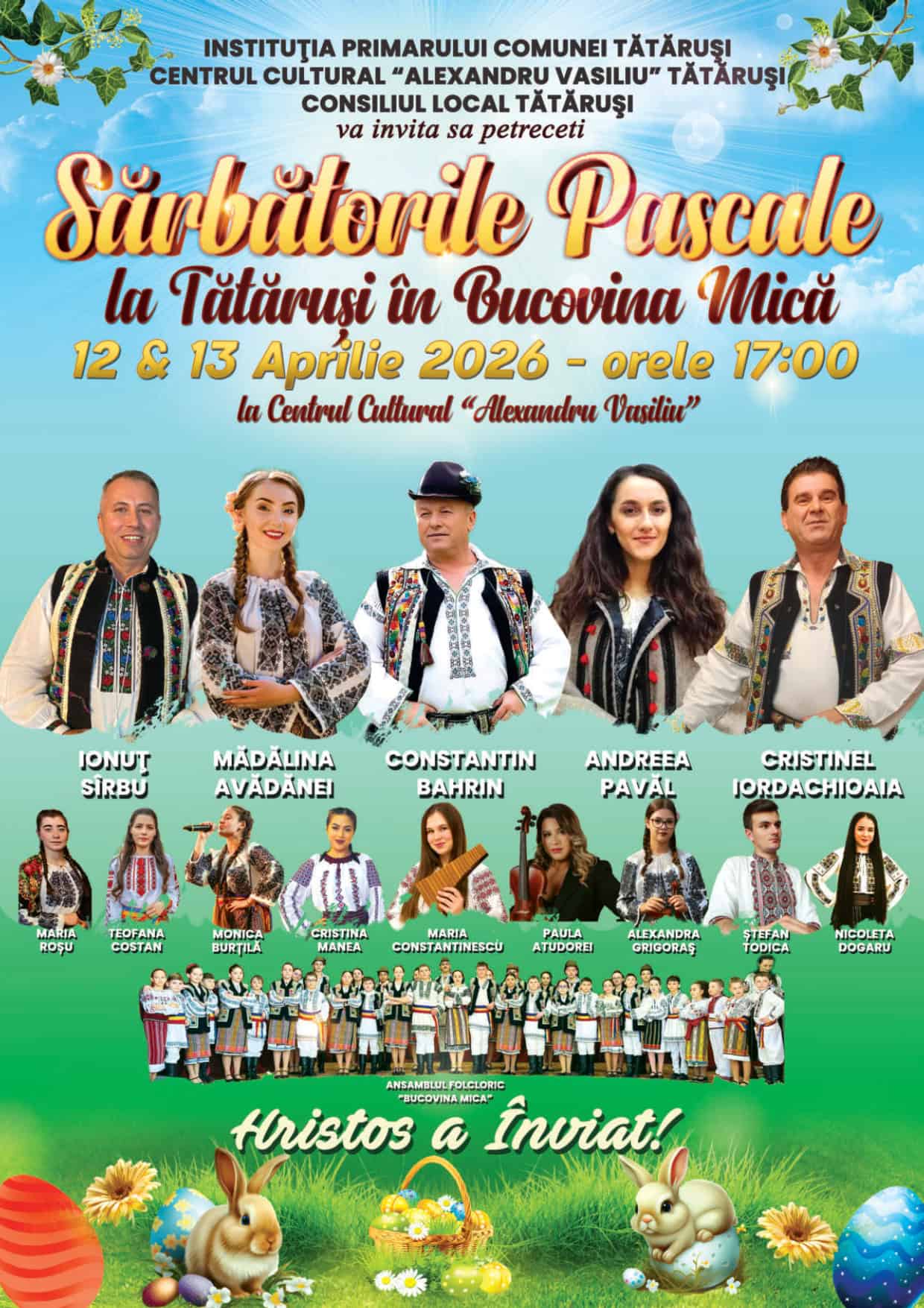 Comuna Tătăruși se pregătește de sărbătoare în perioada Paștelui, când la Centrul Cultural „Alexandru Vasiliu” vor avea loc spectacole folclorice și activități dedicate comunității, în prima și a doua zi de Paște.AdsPrimarul Costel Iosub a anunțat organizarea unui program special pe 12 și 13 aprilie, începând cu ora 17:00, subliniind importanța acestor evenimente pentru comunitate:„Suntem în această perioadă a Sfintelor Sărbători Pascale și, ca de fiecare dată, organizăm un eveniment cultural mult așteptat de tătărușeni și nu numai. Vă invităm să petreceți sărbătorile pascale aici, în Bucovina Mică”, a declarat edilul.Evenimentul va aduce pe scenă artiști locali și invitați speciali, printre care Constantin Bahrin, alături de tineri interpreți precum Cristinele Iordăchioaia și Ionuț Sîrbu, dar și prezentatoarele Mădălina Avădăni și Andreea Pavăl.Un rol central îl vor avea copiii și tinerii din ansamblul „Bucovina Mică”, care reprezintă o adevărată pepinieră de talente locale. Peste 50 de copii participă constant la repetiții și reprezintă comuna la festivaluri, unde au obținut numeroase premii.Viceprimarul Mirel Lazăr a subliniat importanța transmiterii tradițiilor:„Acești copii reprezintă inima activităților cultural-artistice din comunitatea noastră. Tradițiile, cântecul și portul popular sunt duse mai departe din generație în generație.”Activități pentru copii la baza sportivăPe lângă spectacole, autoritățile locale au pregătit activități recreative la baza sportivă din comună, unde copiii pot beneficia de terenuri de sport, locuri de joacă moderne și gonflabile.Primarul a precizat că aceste investiții au scopul de a încuraja mișcarea în aer liber și de a oferi alternative la timpul petrecut în fața ecranelor:„Ne dorim să scoatem copiii de pe telefon și să îi aducem în aer liber, într-un spațiu sigur și atractiv.”Accesul la gonflabile este reglementat, fiind destinat copiilor cu vârste între 3 și 12 ani, iar părinții sunt încurajați să respecte regulile afișate. După sărbătorile pascale, la Tătăruși va avea loc și cea de-a treia ediție a unui festival de șah pentru copii, organizat în parteneriat cu o federație internațională, eveniment care atrage participanți din mai multe județe. Autoritățile locale invită toți locuitorii, dar și pe cei reveniți acasă din diaspora, să participe la evenimentele organizate de Paște, pentru a celebra tradițiile și comunitatea în „Bucovina Mică”.