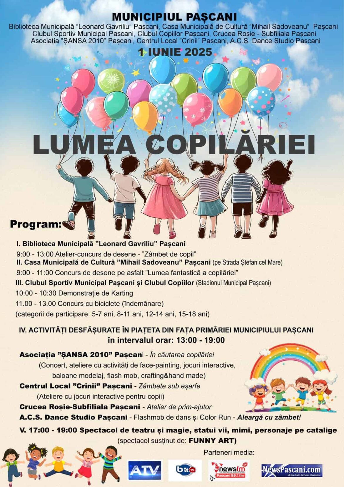 Municipiul Pașcani pregătește o serie de activități cu ocazia Zilei Copilului, sub titulatura „Lumea Copilăriei”, programate pentru data de 1 iunie 2025. Aceste evenimente se vor desfășura în diverse locații din oraș, cum ar fi Biblioteca Municipală „Leonard Gavriliu”, Casa Municipală de Cultură „Mihail Sadoveanu”, Clubul Sportiv Municipal, Clubul Copiilor și Piațeta din fața Primăriei.