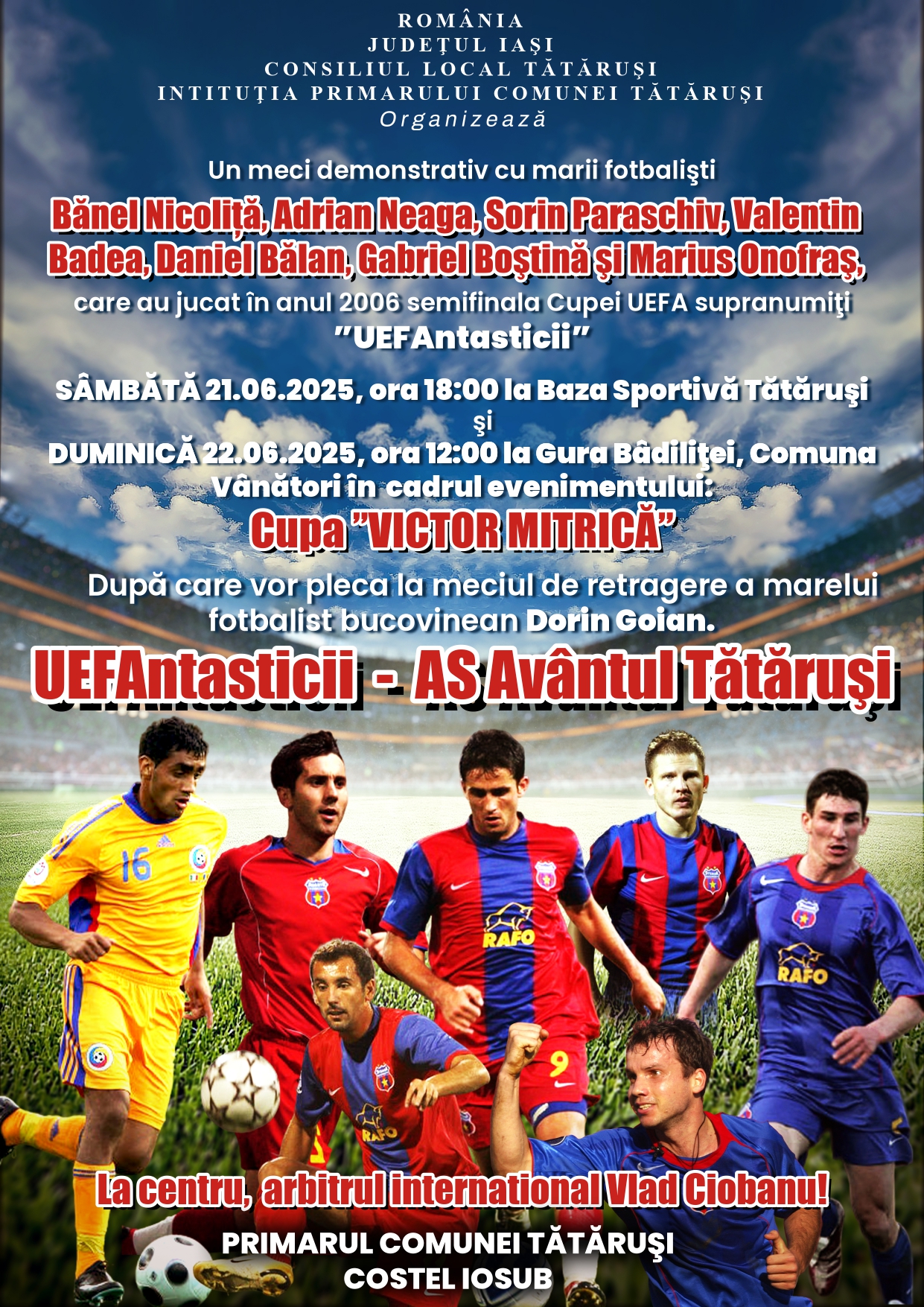 Comuna Tătăruși va găzdui un eveniment sportiv deosebit în weekendul 21-22 iunie 2025. Consiliul Local și Primăria Comunei Tătăruși organizează un meci demonstrativ de fotbal cu participarea unor nume importante din fotbalul românesc: Bănel Nicoliță, Adrian Neaga, Sorin Badea, Daniel Bălan și Gabriel Boștină, jucători care au făcut parte din echipa națională și au participat la semifinala Cupei UEFA în anul 2006.Ads.Meciul va avea loc în două etape. Astfel, sâmbătă, 21 iunie 2025, ora 18:00 pe stadionul din Tătăruși iar duminică, 22 iunie 2025, ora 12:00 la stadionul din comuna Vânători.Evenimentul face parte din Cupa „Victor M” și va fi urmat de un meci al echipei „UEFAntasticii – AS Avântul Tătăruși”. Evenimentul promite o atmosferă festivă și o ocazie unică pentru locuitorii comunei Tătăruși și din împrejurimi de a-și întâlni idolii fotbalului românesc.