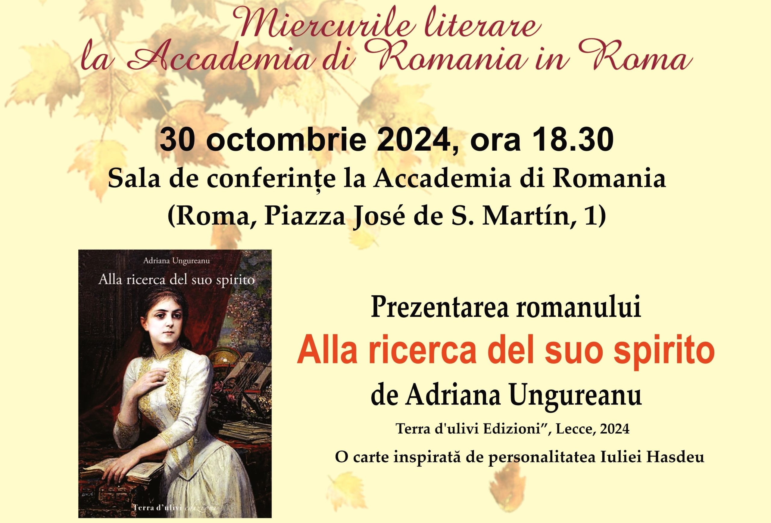 În data de 30 octombrie 2024, la ora 18.30, Accademia di Romania în Roma, împreună cu Asociația „Universul Prieteniei” din Iași, organizează o nouă întâlnire literară. Acest eveniment se încadrează în seria „Miercurile literare la Accademia di Romania în Roma”. De această dată, va fi prezentat volumul „Alla ricerca del suo spirito”, publicat de Terra d’ulivi Edizioni, Lecce, în 2024. Autoarea și traducătoarea lucrării, Adriana Ungureanu, va beneficia de o traducere revizuită de Alexandru Laszlo și Cinzia Demi, iar prefața este semnată de Cinzia Demi.