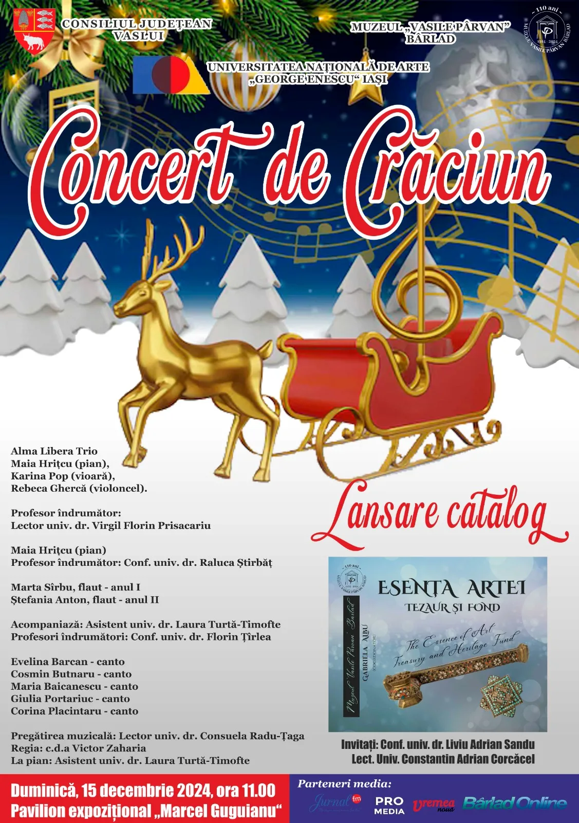 Lansarea catalogului va fi urmată de tradiţionalul Concert de Crăciun, oferit de studenţii talentaţi ai Universităţii Naţionale de Arte ‘George Enescu’ din Iaşi. Aceştia ne vor încânta cu un repertoriu variat, care include lucrări semnate de compozitori renumiţi.