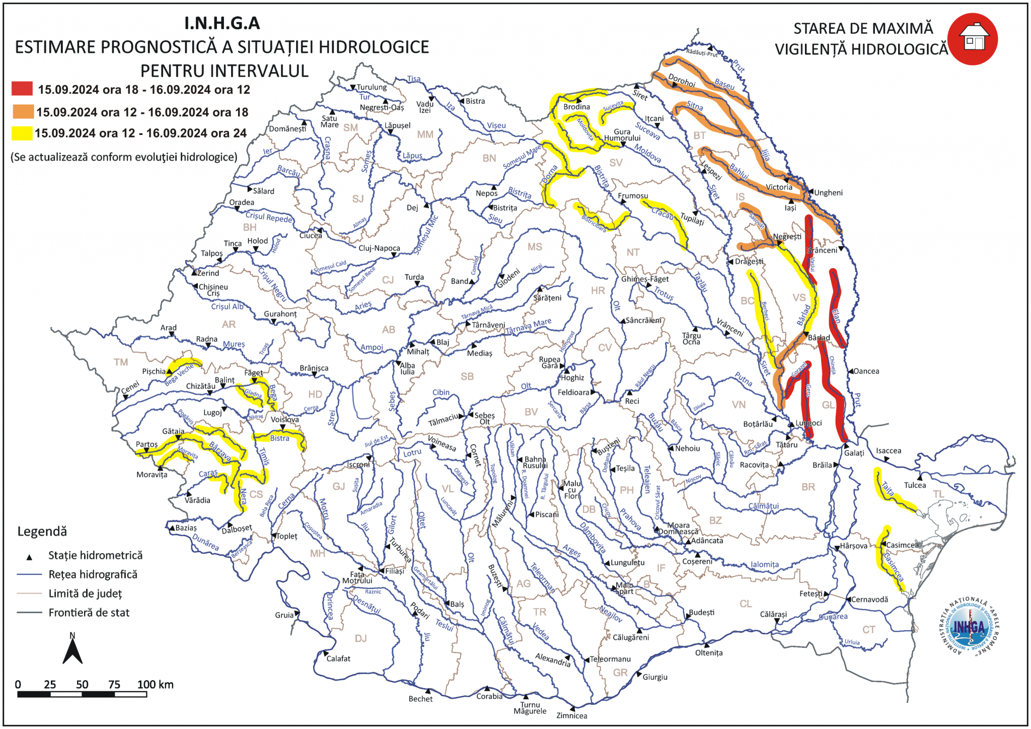 Interval: 15.09.2024 ora 12:00 – 16.09.2024 ora 18:00. Se preconizează fenomene hidrologice periculoase în râurile din bazinele hidrografice: Bârlad (sector amonte S.H. Negrești și afluenții din aval S.H. Negrești — amonte S.H. Bârlad), Bârlad (afluenți mici din aval S.H. Bârlad), râul Bârlad — pe sectorul aval S.H. Bârlad (județele: Vaslui, Iași și Galați), Siret (afluenții de stânga în aval S.H. Lungoci (județul Galați)), Prut (afluenți amonte confluență cu râul Jijia (județele: Botoșani și Iași)), Jijia (județele: Botoșani și Iași), Prut (afluenți în aval confluență cu râul Jijia (județele: Iași, Vaslui și Galați)).