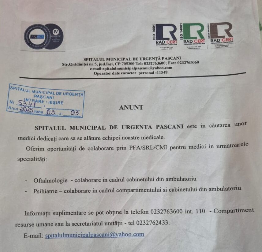 Cerere de medici la Spitalul Municipal de Urgență Pașcani