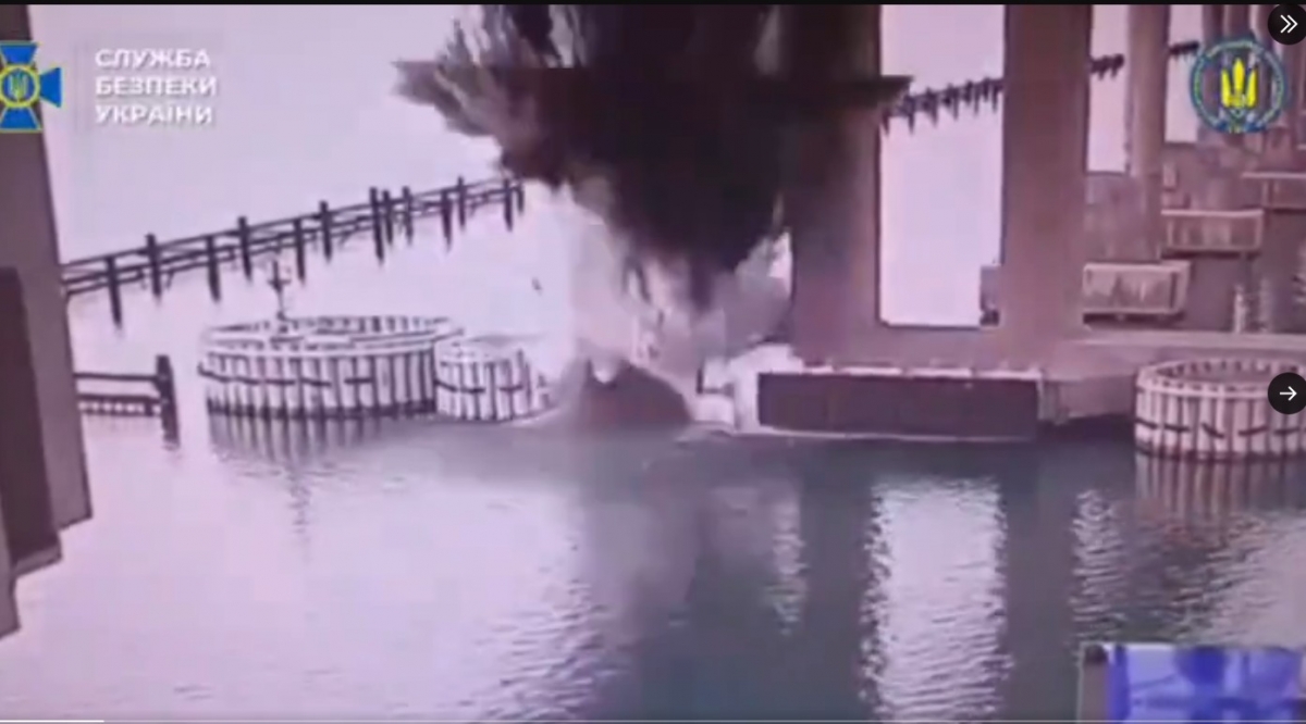 Serviciul de Securitate al Ucrainei (SBU) a anunțat desfășurarea unei „operațiuni speciale unice” care a avut ca scop distrugerea suporturilor podului din Crimeea. Într-un comunicat de presă, SBU a menționat că agenții săi au minat stâlpii podului și au detonat un dispozitiv exploziv cu o capacitate de aproximativ 1.100 de kilograme echivalent TNT la ora 4:44 a.m. pe 3 iunie. Conform declarațiilor SBU, explozia a deteriorat structura subacvatică a suporturilor podului, lăsându-l în stare precară. De asemenea, s-a precizat că nu au existat victime civile în urma detonării.